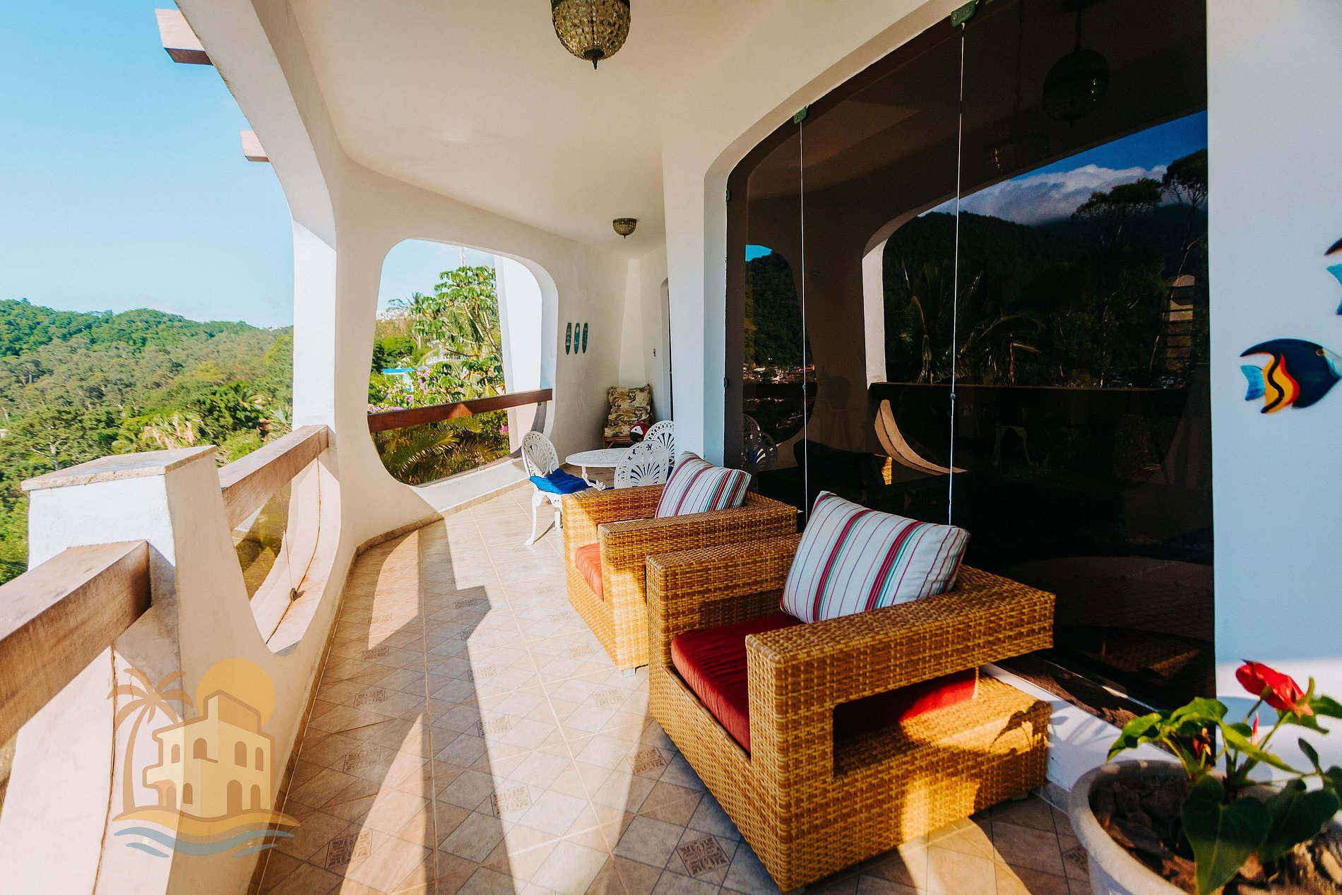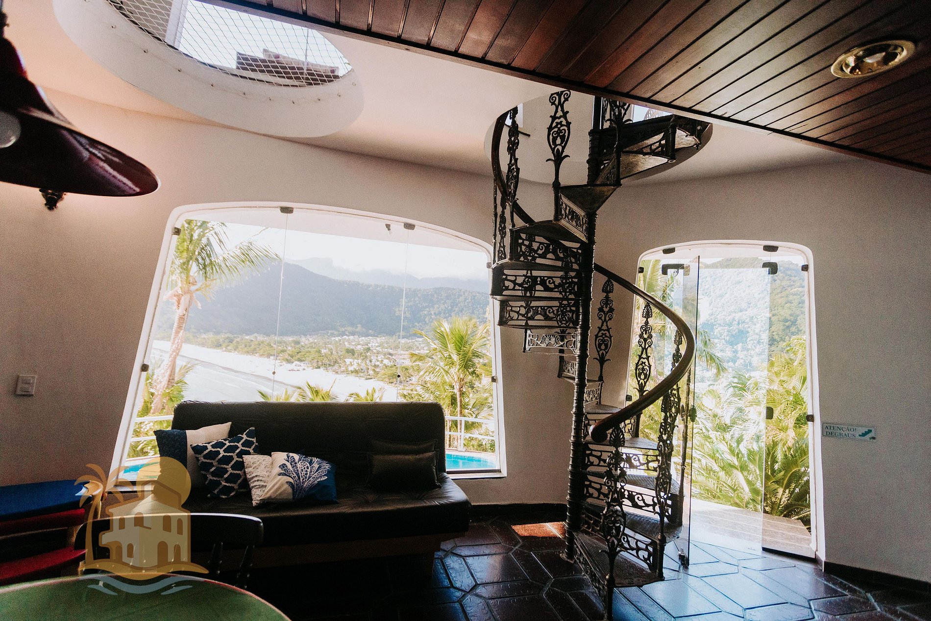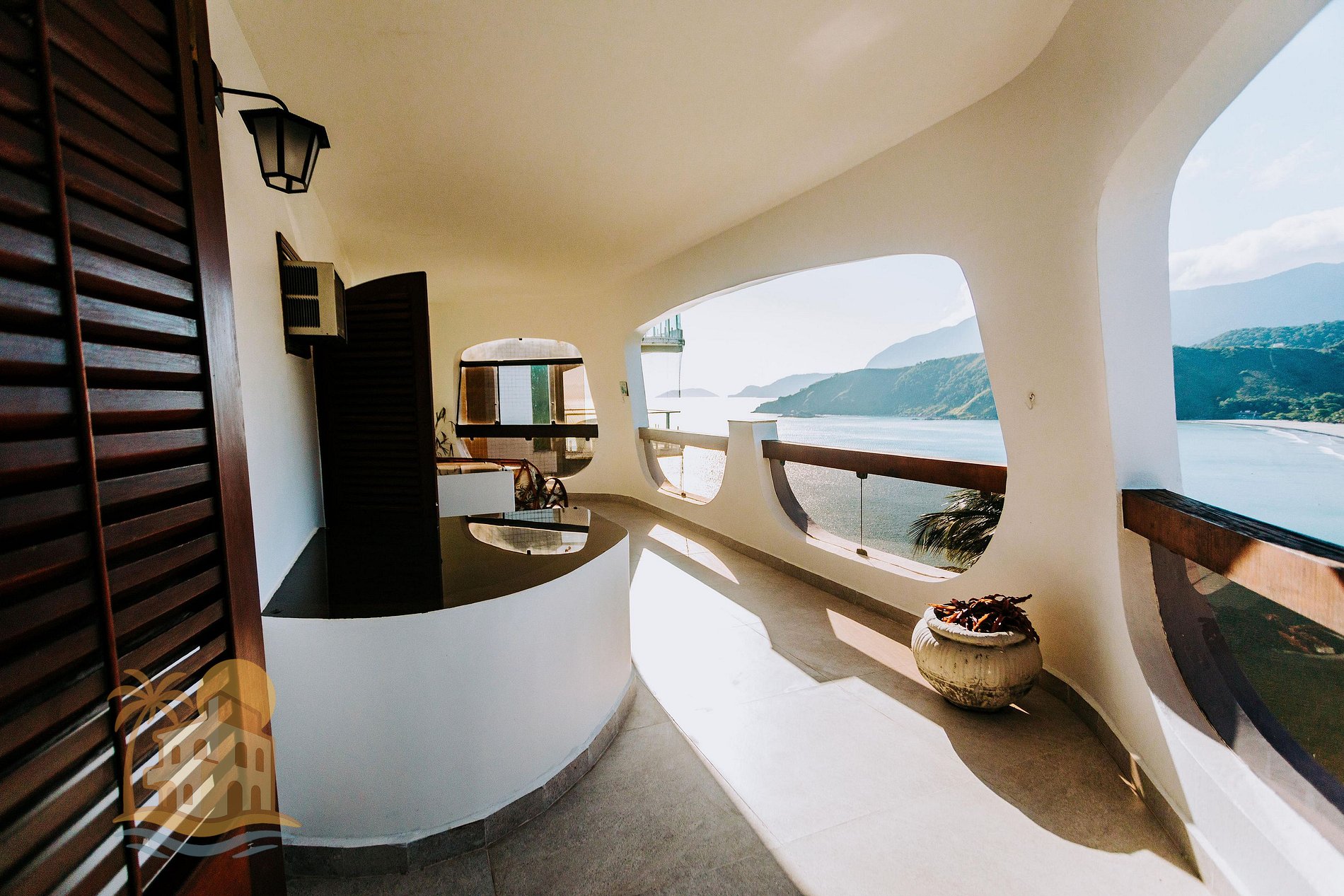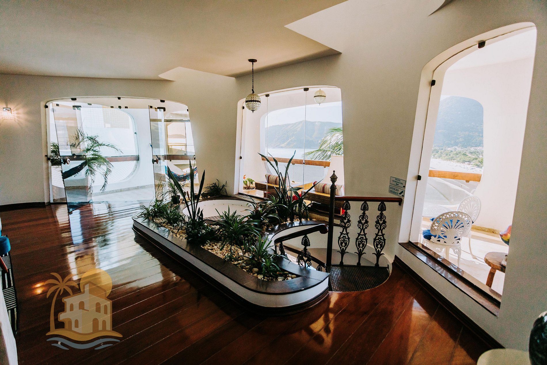 No lado externo, o grande destaque são os mirantes com vista para o mar, perfeitos para contemplar o nascer ou pôr do sol, ler um livro ou apenas relaxar ao som das ondas. A conexão com a natureza, o silêncio e a exclusividade do espaço criam um ambiente ideal para descanso, lazer e convivência.