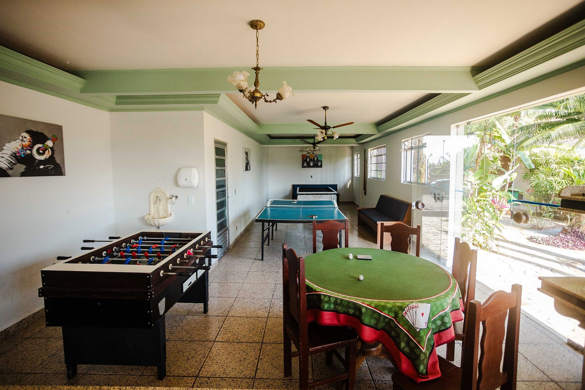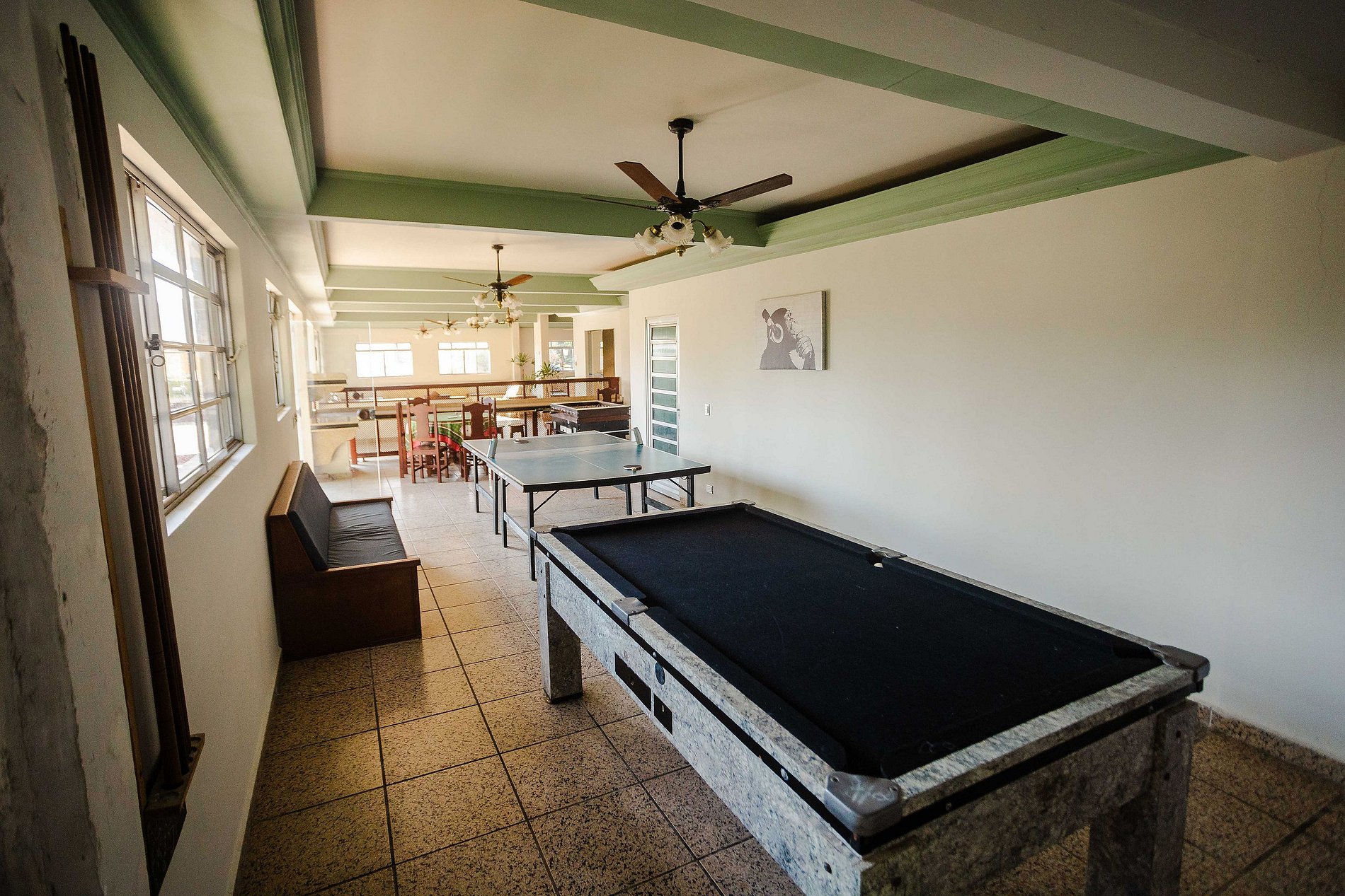 Salão de jogos com mesa de bilhar, pingue-pongue, pebolim e mesa de cartas, garantindo diversão para todas as idades;