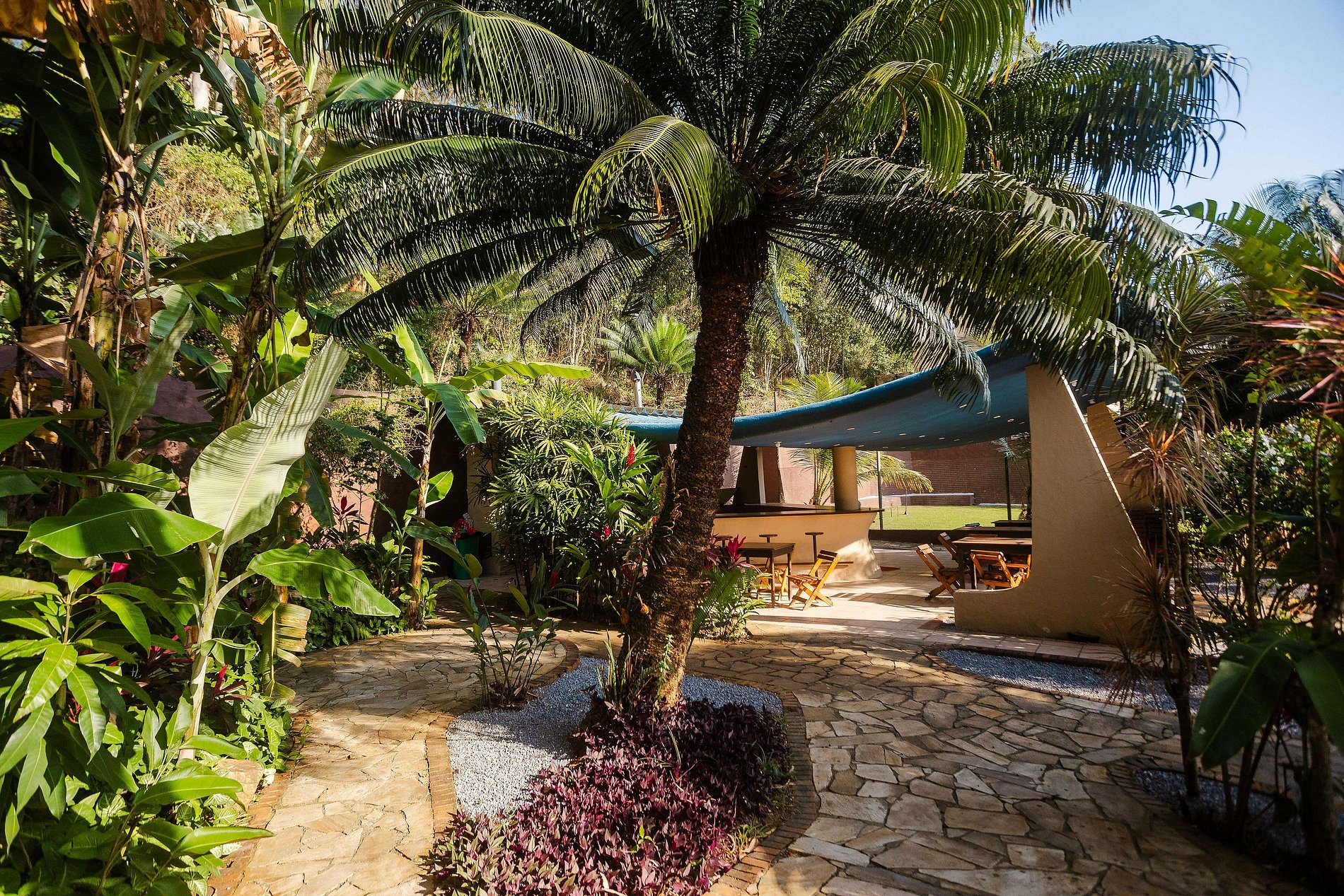 Jardins tropicais bem cuidados, com caminhos de pedra entre plantas nativas e palmeiras que criam uma atmosfera relaxante;